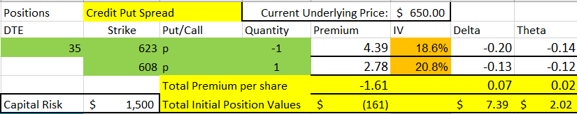 - Initial Setup: Sell 623 put (Δ ≈ 20), buy 608 put (Δ ≈ 13), 5 weeks to expiration.
